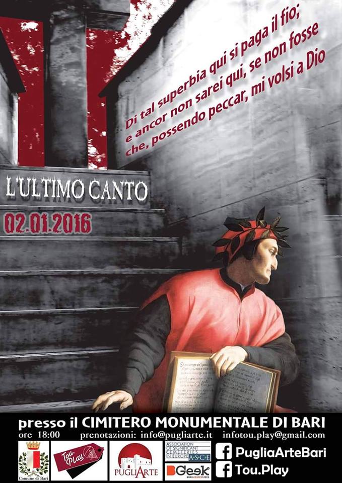 Il 2 gennaio, in occasione del 750° anniversario dalla nascita del sommo poeta Dante Alighieri, PugliArte e Tou.Play, con il patrocinio del Comune di Bari, propongono un itinerario alla scoperta dei tesori del cimitero monumentale attraverso i versi del Purgatorio dantesco. Il progetto L’ultimo Canto, infatti, guiderà il pubblico in un viaggio letterario nell’aldilà: attraverso lo strumento della visita guidata esperienziale, condotta da guide narranti, in un contesto scenografico di potente suggestione si riscopriranno e valorizzeranno i tesori di un vero e proprio museo a cielo aperto.