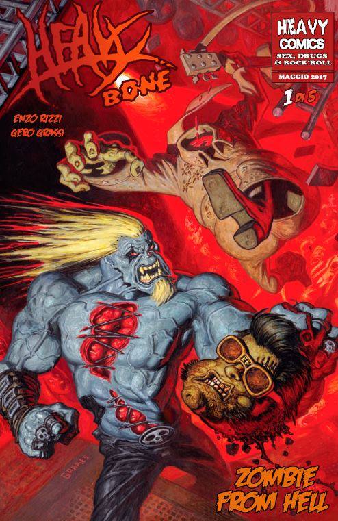 “L’etichetta “HEAVY Comics” – prosegue l’autore – mi permetterà di seguire in prima persona tutte le fasi del “progetto H.B.” dalla nascita dell’idea alla sua realizzazione, copertine ed editoriali inclusi, non che la distribuzione e le vendite, compreso il merchandise. Sento la necessità di sentire in maniera diretta il polso della situazione per poter così gestire al meglio i contatti con i distributori, le fumetterie e non solo. HEAVY Comics si limiterà alla pubblicazione di cinque albi aventi come protagonista il mio zombie maleodorante (che, lo ricordiamo, nel 2014 ha esordito negli Stati Uniti sulle pagine del prestigioso magazine Heavy Metal) storie che ho scritto spingendo al massimo l’acceleratore sulle mie più grandi passioni, la musica Rock/Metal ed i fumetti horror ed underground. Vedremo così il nostro Heavy Bone incontrare Elvis, Alice Cooper, Gene Simmons, Blakie Lawless (ma…saranno veramente loro???), i Led Zeppelin, i Deep Purple Frank Zappa, Dimebagg Darrel, Kurt Cobain e poi i sosia di Eric Clapton, di Rob Halford e di tante altre famose rockstar. Non mancheranno citazioni e riferimenti al “rock’n roll circus” e quindi a Kiss, Motorhead, Rolling Stones, Aerosmith, Motley Crue, Sly and the Family Stone, il tutto innaffiato da ettolitri di sangue, corpi squartati, maciullati ,frattaglie varie nonché groupie disinibite alla mercè del nostro zombie.
