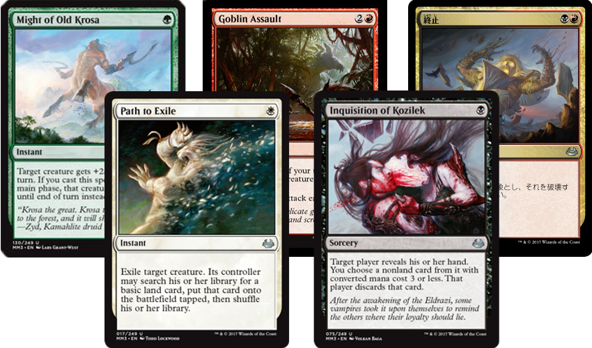 Oltre le apprezzate ristampe tra le rare, tra cui non c’è da dimenticare il ritorno dell’accoppiata Angelo della Restaurazione con Thragtusk, a fare la felicità di molti giocatori sarà il reparto delle non comuni. Attualmente ben fornito di piacevoli sorprese, vediamo finalmente il ritorno alla giusta rarità di Indagini di Kozilek, accompagnata da Sentiero dell’Esilio, Potenza della Vecchia Krosa, Terminare e Assalto Goblin abbassato a non comune da rara.